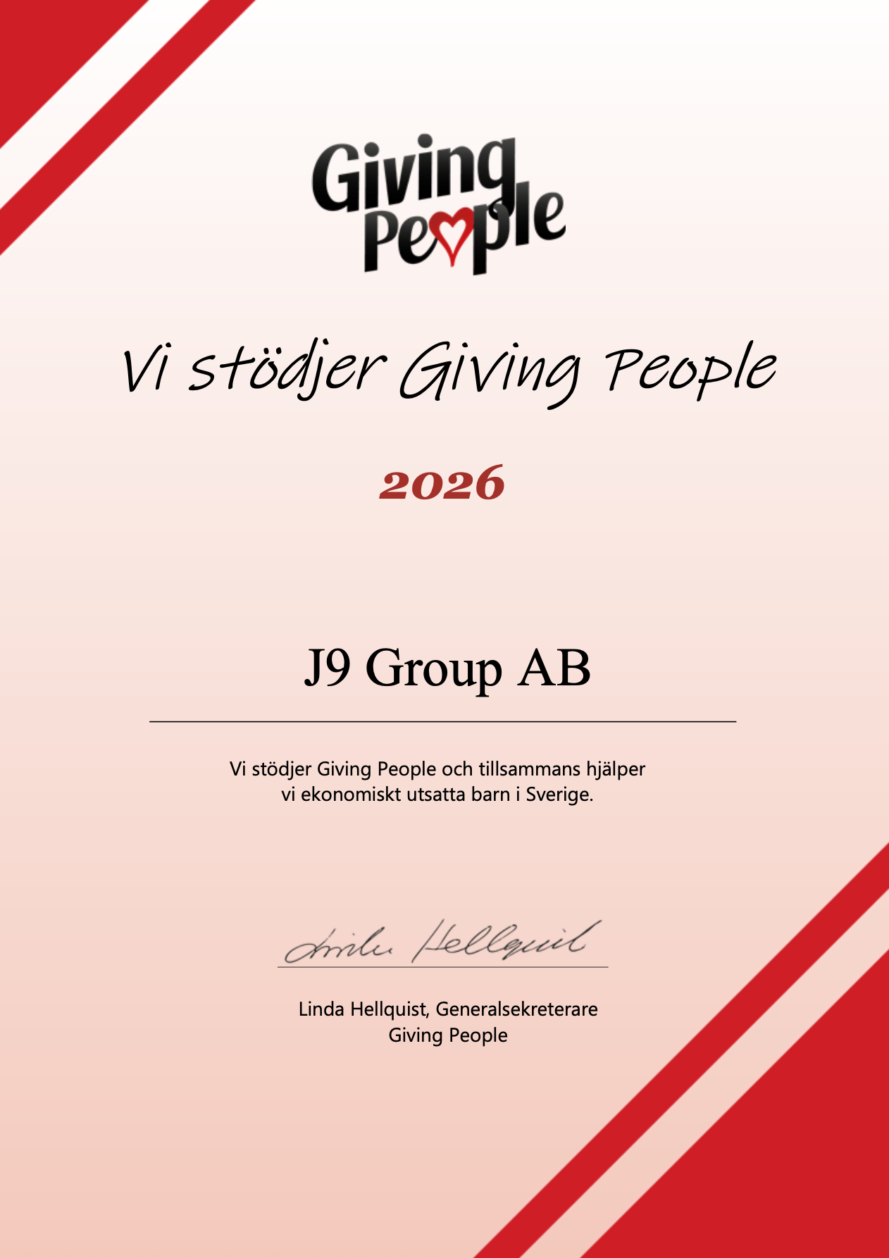 Hos oss på J9 Group AB tror vi på att ta ansvar – inte bara i vårt arbete, utan även i samhället. Därför stödjer vi Giving People, en organisation som arbetar för att hjälpa ekonomiskt utsatta barn och familjer i Sverige.